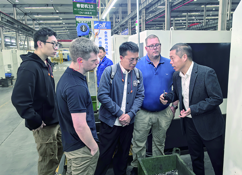 客戶首站參觀了生產車間,依次考察了原材料檢驗、工序加工、數控加工、熱處理、表面處理、裝配及包裝上油等全流程。車間整潔的環境、先進的數智化設備以及員工專注的專業態度,獲得了客戶的充分肯定。雙方在參觀過程中不時駐足,就具體工藝細節展開現場探討。嚴謹的操作流程與精細的質量管控體系,進一步向客戶展現了興化公司對產品品質的極致追求。